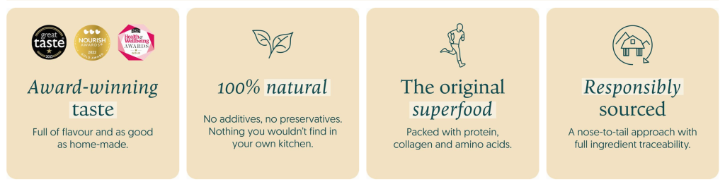 It’s won multiple awards for it’s taste, including the prestigious Great Taste aware, Nourish Award, and the Health & Wellbeing award. Full ingredient traceability and 100% natural, it’s easy to see why it’s earned a top spot among UK bone broth customers.