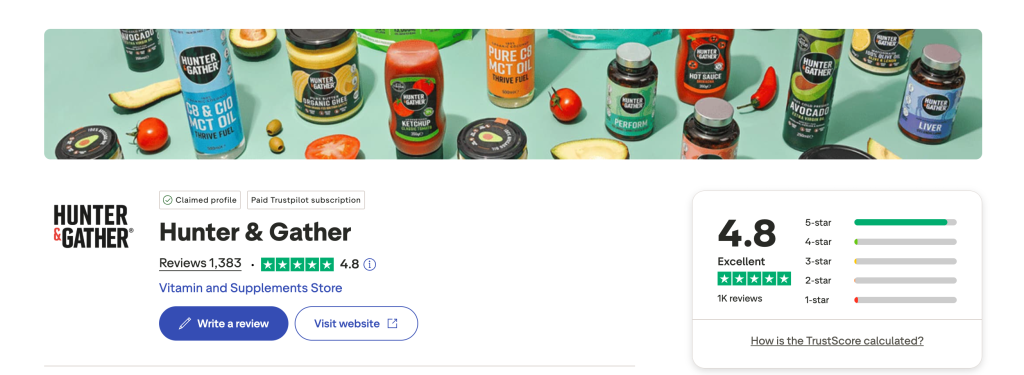 Hunter and Gather holds a 5-star Excellent rating on Trustpilot from over 1,330 reviews, which is among the highest in the UK collagen market. On Amazon, the Bovine Collagen Powder maintains a 4.6 out of 5 rating from over 1,400 reviews with Amazon’s Choice status. The brand actively responds to both positive and negative reviews on both platforms.