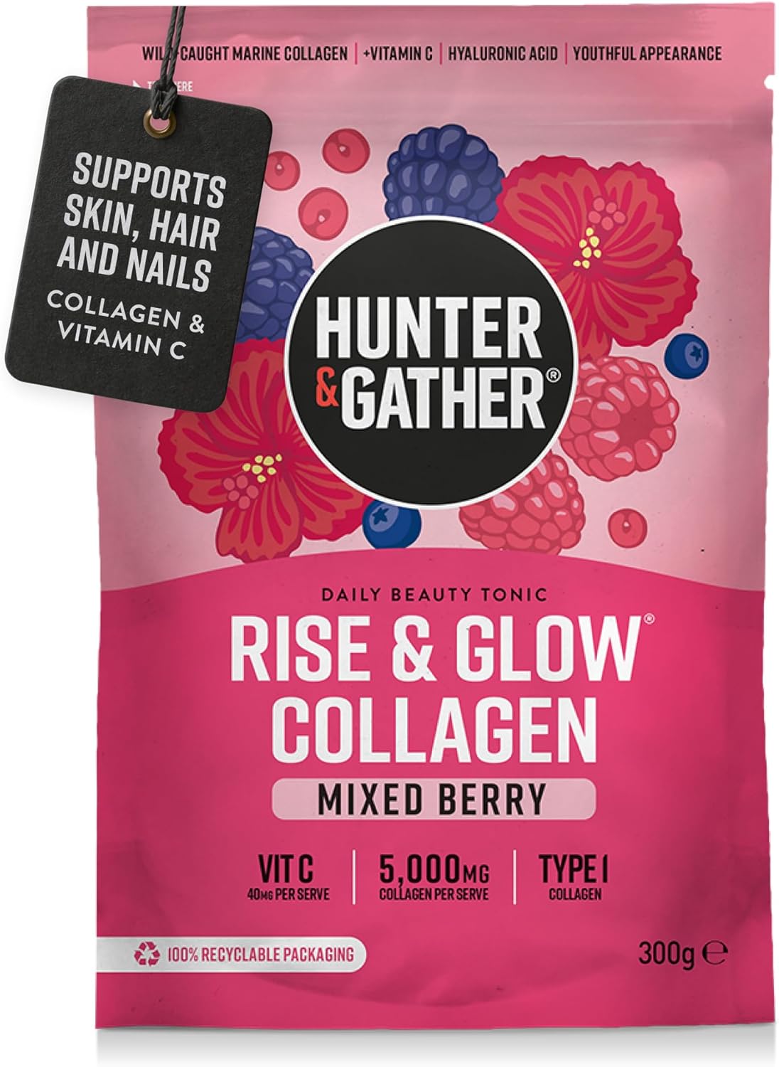 Rise and Glow is the most premium and most targeted product in the Hunter and Gather collagen range. It combines 5,000mg of hydrolysed marine collagen with hyaluronic acid, natural vitamin C from acerola berry, and antioxidant-rich berry powders including blueberry, raspberry, cranberry, and blackcurrant. The formulation is specifically designed for skin health, leveraging the synergistic relationship between collagen peptides, hyaluronic acid, and vitamin C.