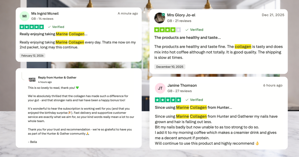 What’s nice is that Hunter & Gather personally respond to many reviews on Trustpilot (check out the image above!), both positive and the very rare negative / neutral reviews. It adds a nice touch even though this collagen company is now one of the largest in the UK.